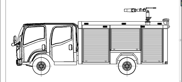 整车由消防员乘员室和车身两大部分组成,车身布置采用内藏罐式结构,左右两侧为器材箱,中部为水罐,器材箱后部为泵房。